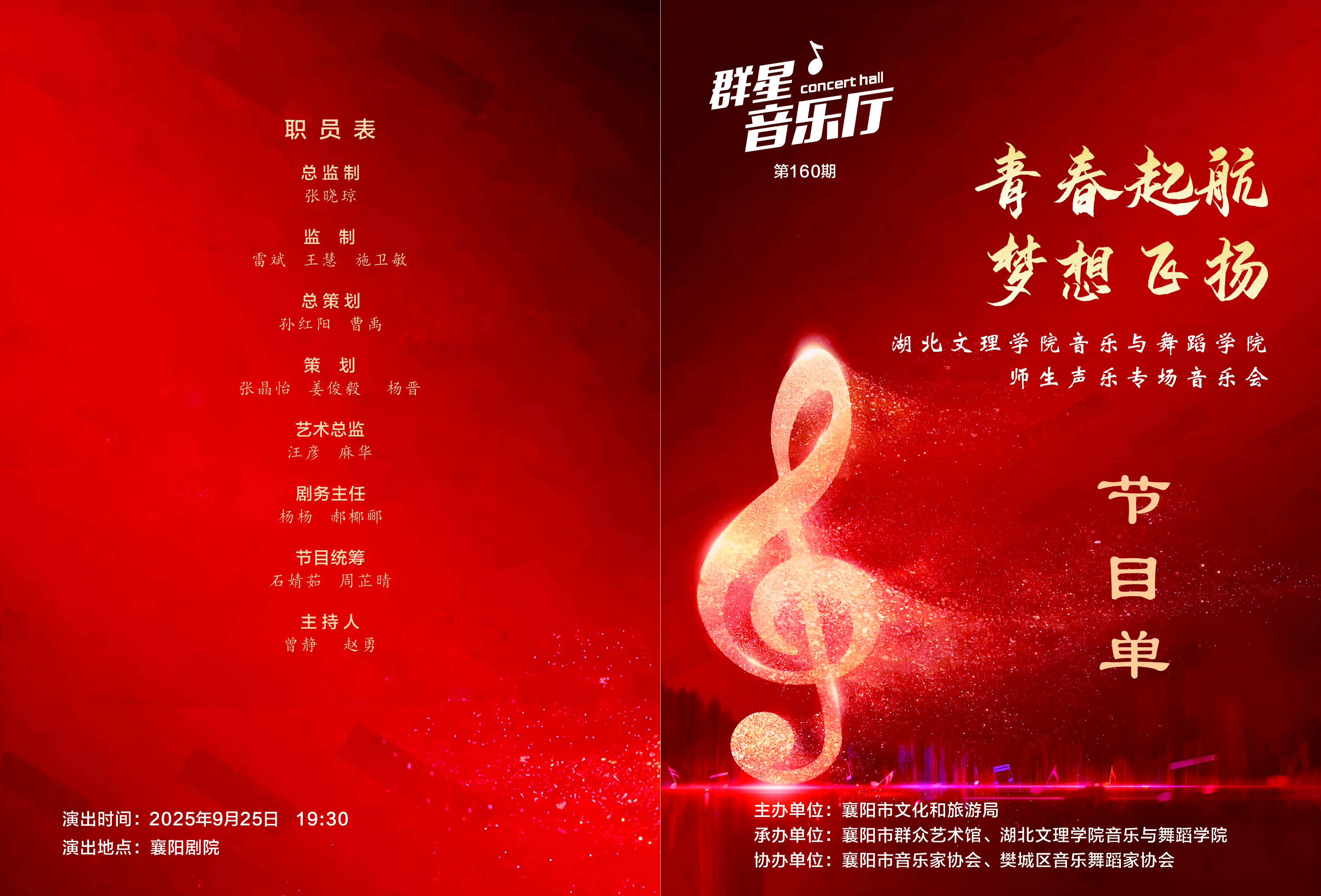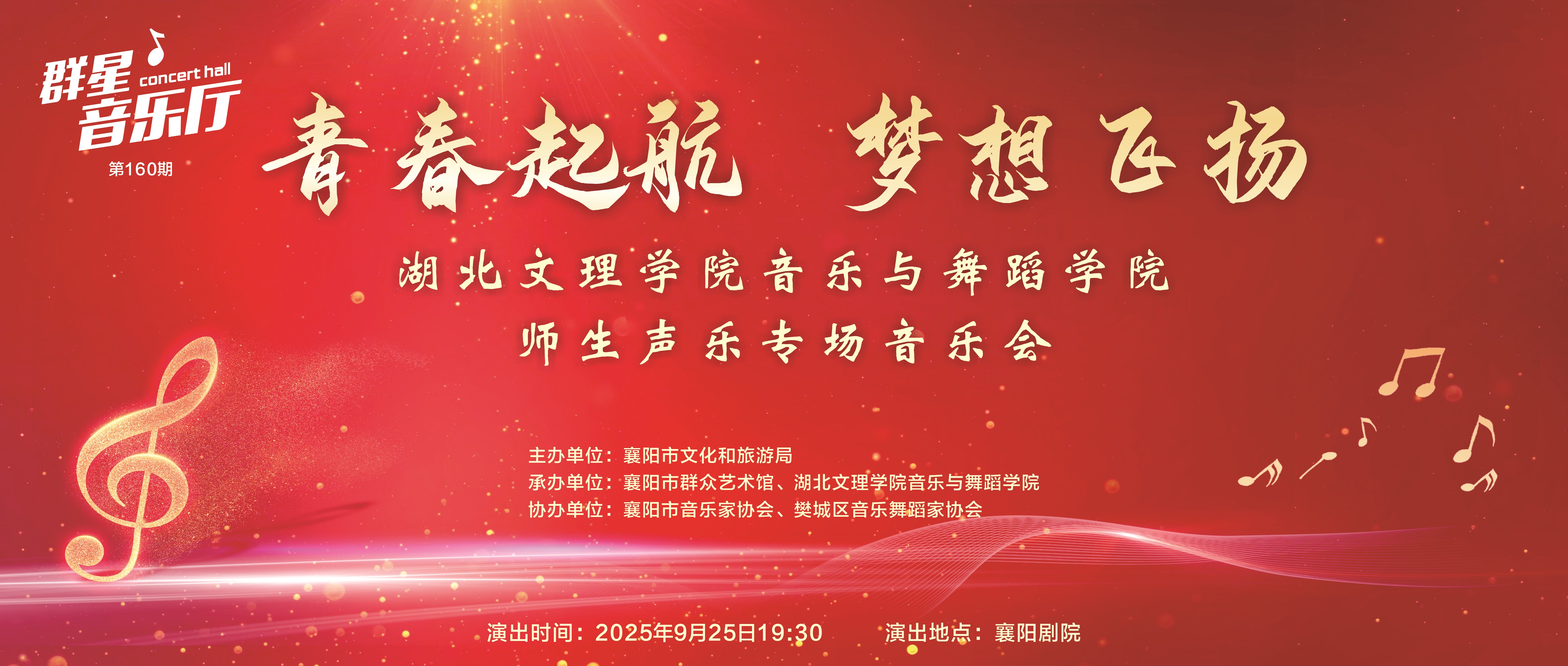 金秋时节,一场动人的青春乐章即将奏响。襄阳市群众艺术馆携手湖北文理学院音乐与舞蹈学院,将于2025年9月25日晚7:30,在襄阳剧院举办“群星音乐厅”第160期“青春启航·梦想飞扬”湖北文理学院音乐与舞蹈学院师生声乐专场音乐会。