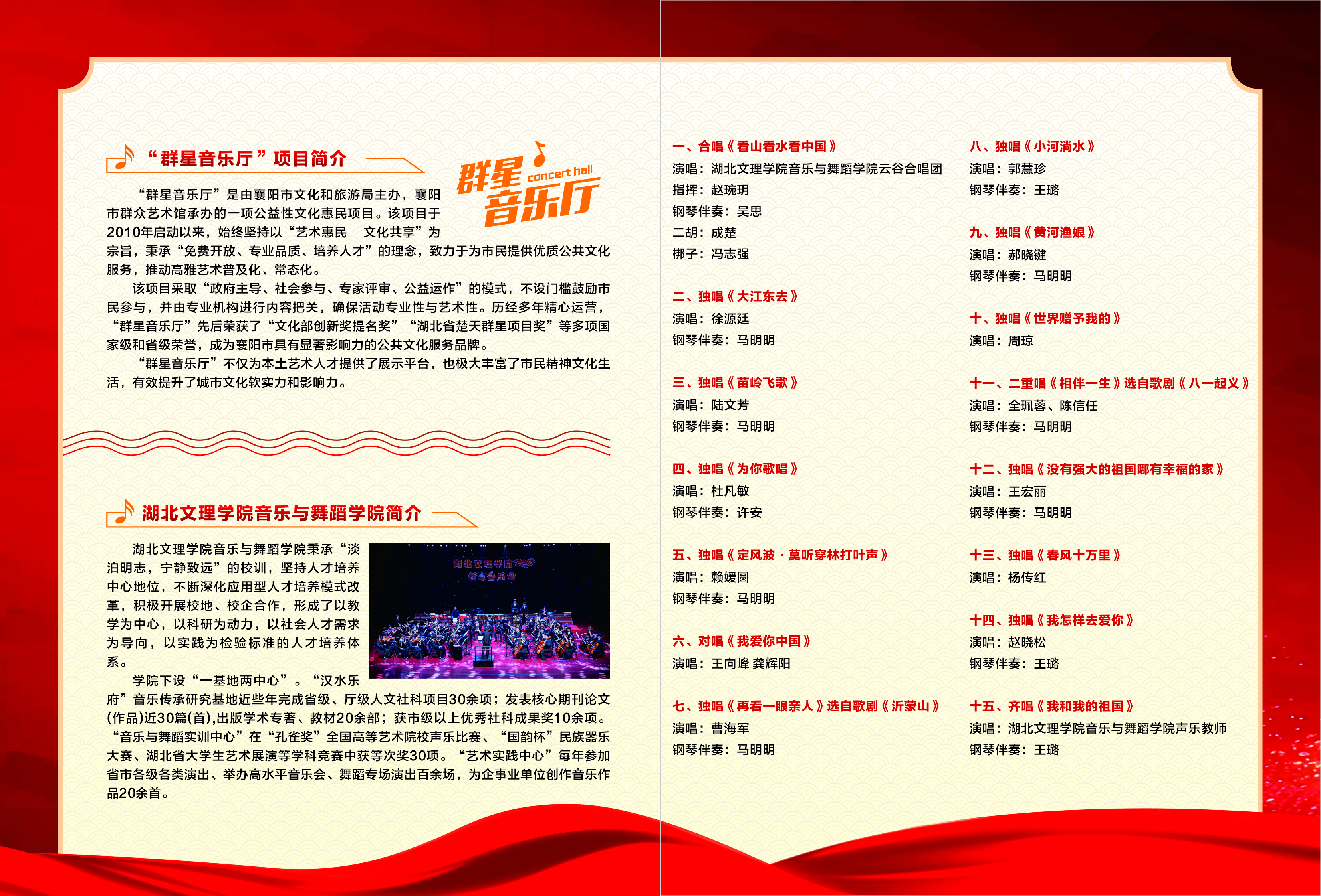本场音乐会由湖北文理学院音乐与舞蹈学院声乐专业师生联袂呈现,汇聚声乐艺术的多元风貌。演出涵盖合唱、独唱、对唱等多种形式,既有《看山看水看中国》《我和我的祖国》这样体现家国情怀的经典作品,也有《大江东去》《苗岭飞歌》《黄河渔娘》等展现民族音乐风采的精品,更有《再看一眼亲人》《相伴一生》等歌剧选段深情演绎。