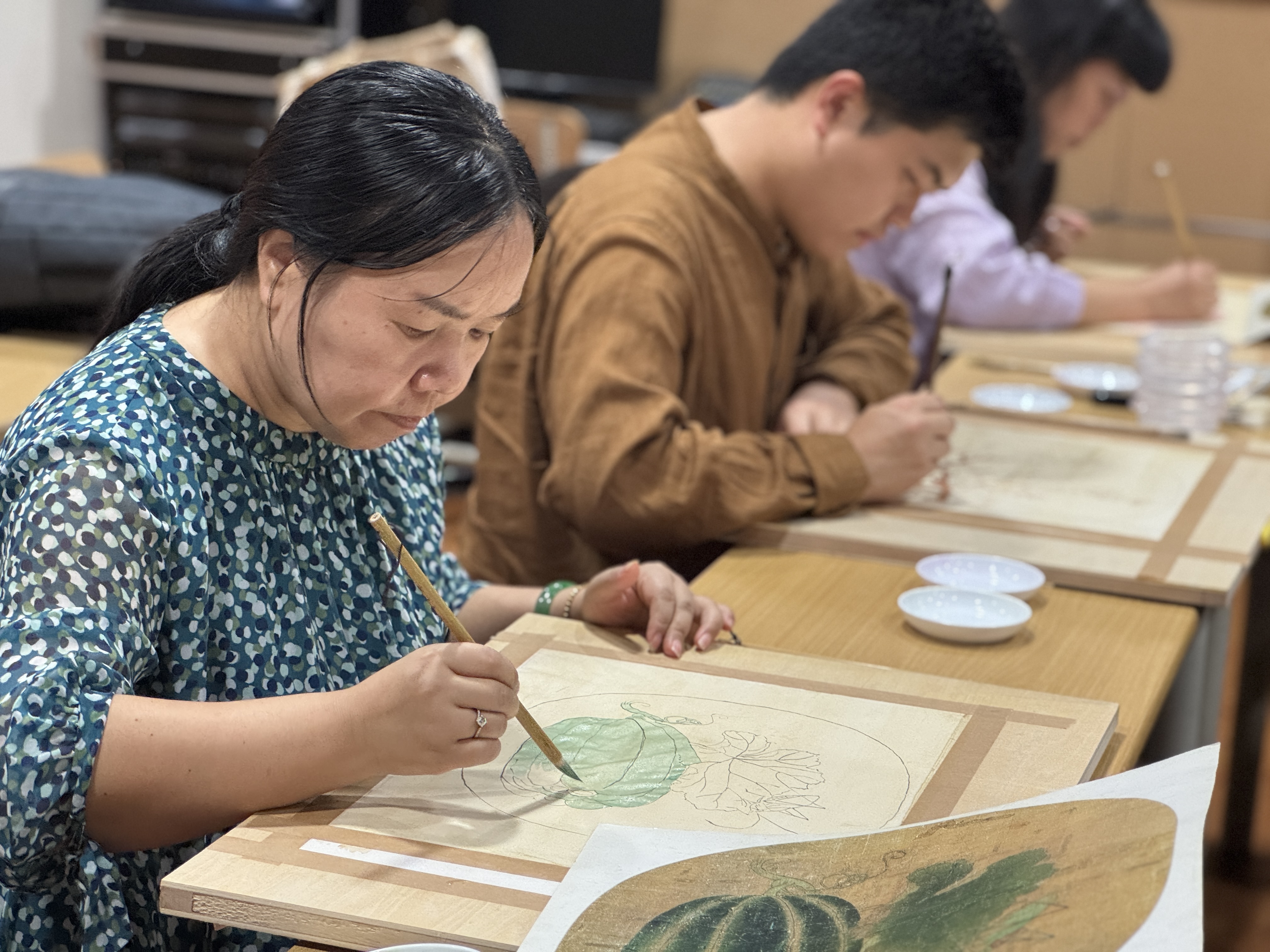 工笔画课堂旨在让学员深入了解宋代工笔画相关知识与技能,学习勾线设色等技艺,领略这一传统绘画艺术的魅力。鲍新月老师从起稿、勾勒线条、分层设色到细节调整逐一向学员们分享工笔绘画技艺。“笔要呼吸,线才有生命。”学员们屏息描线,追求艺术的气息铺满整个教室。