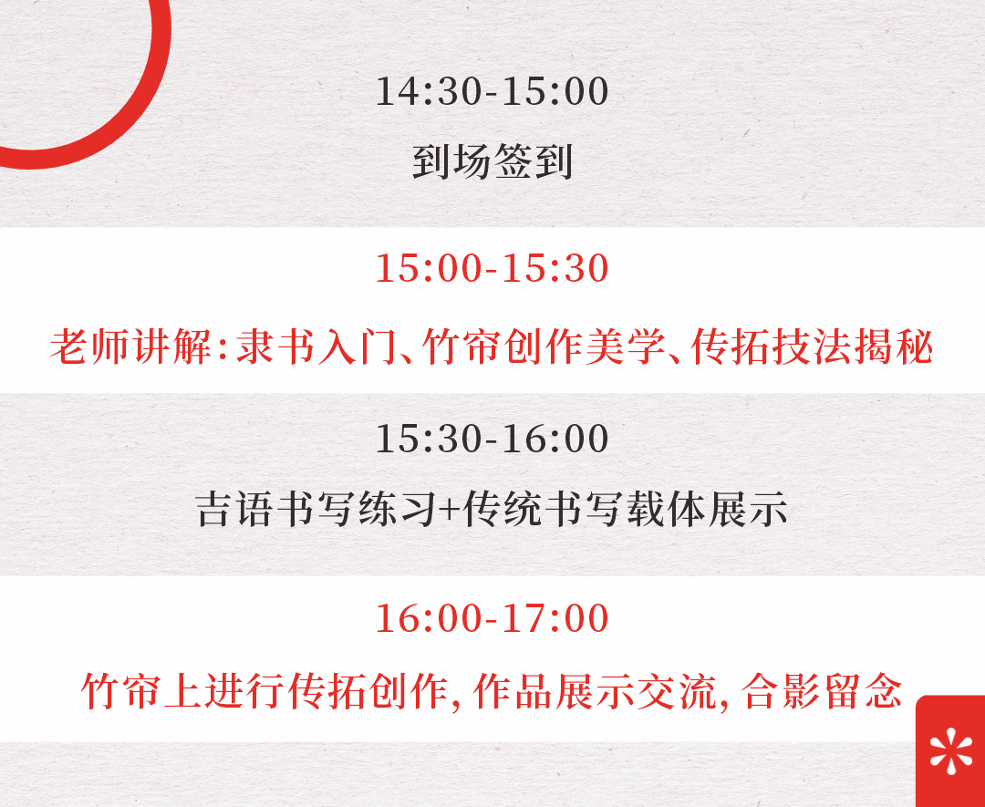 1.名师亲授专业老师将带领大家了解隶书之美、竹帘创作的审美布局,并示范讲解传拓这一非遗技法的精髓与实操。更有绢、牛骨、木片等多种传统书写载体现场展示,拓宽艺术视野。