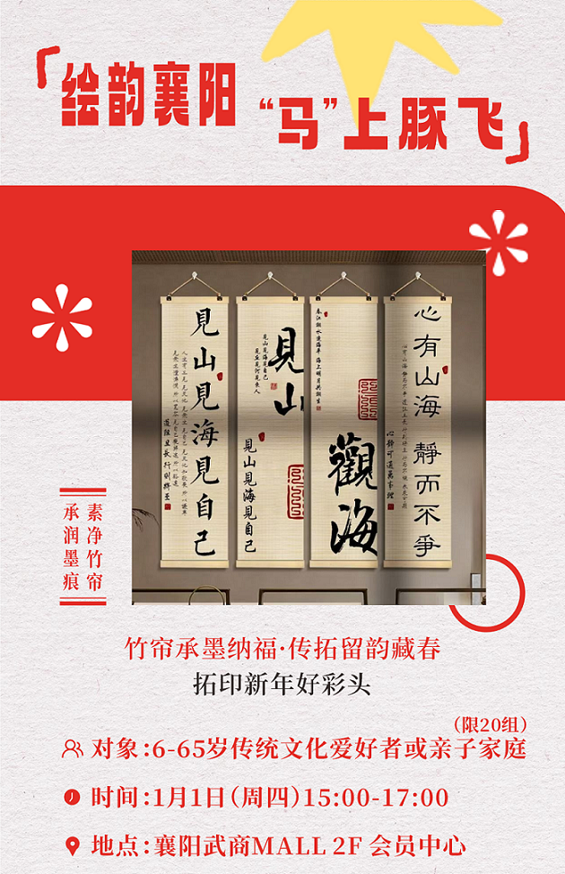 1月1日至3月3日,襄阳市群众艺术馆将在襄阳武商MALL举办“绘韵襄阳”襄阳市青少年美术书法优秀作品巡展。元旦邀您参与一场融合书法美学与传统技艺的沉浸之旅,以竹为纸,以墨为韵,亲手创作一份独一无二的新年礼赞!