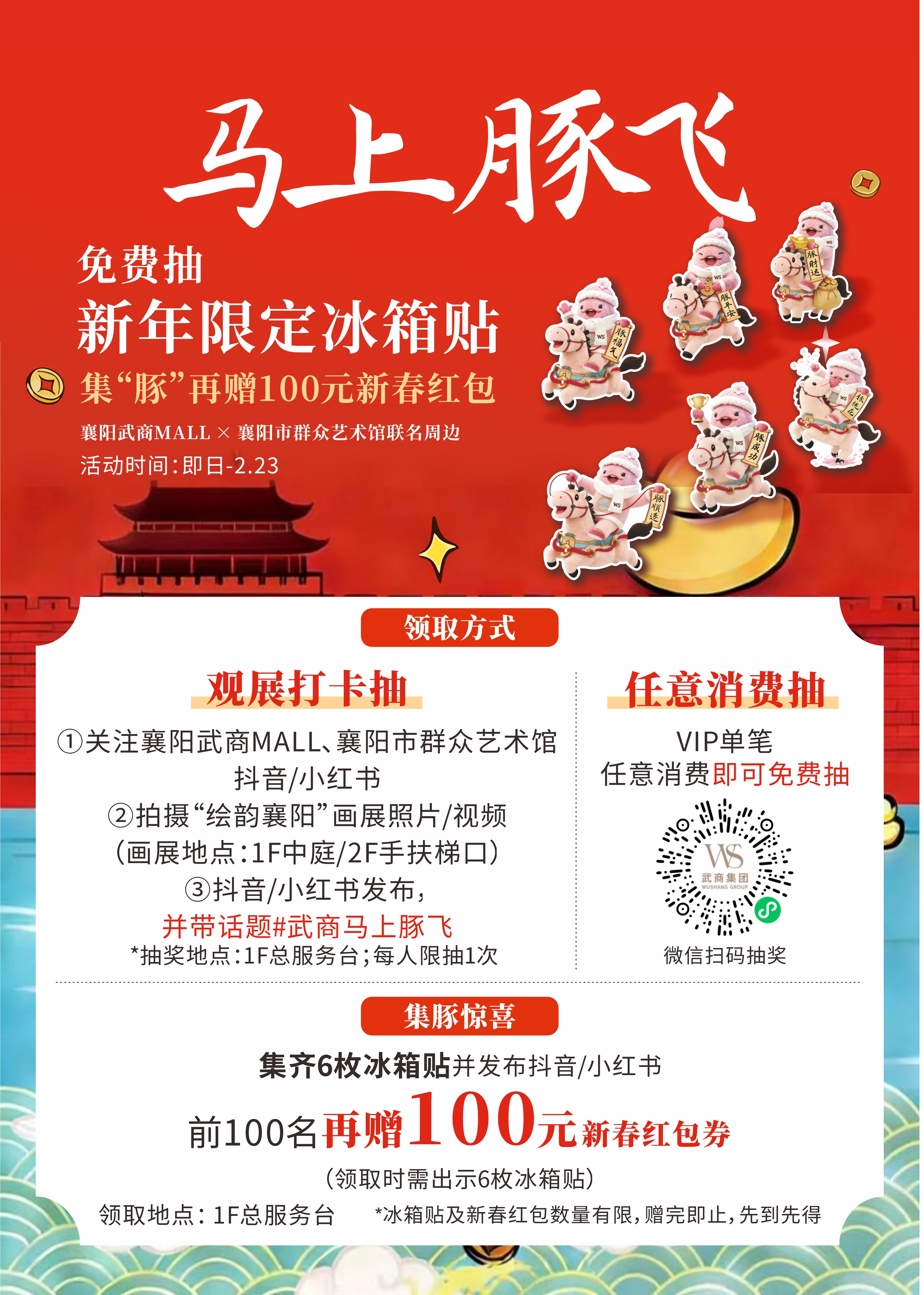 2月17日(大年初一),“领福·年味到家”。当传统佳节遇上当代艺术巡展,将碰撞出别样的年味。活动当日,除了延续“打卡集赞换好礼”的环节外,更添一份笔墨送福的温情:顾客在武商MALL内当日消费,即可凭购物凭证,获赠一幅由本地书法家或优秀书法少年现场手写的春联或“福”字。红纸墨香,不仅承载着新春的祝福,更将展览中蕴含的传统文化气息,以最亲切、最实用的方式,送入千家万户。